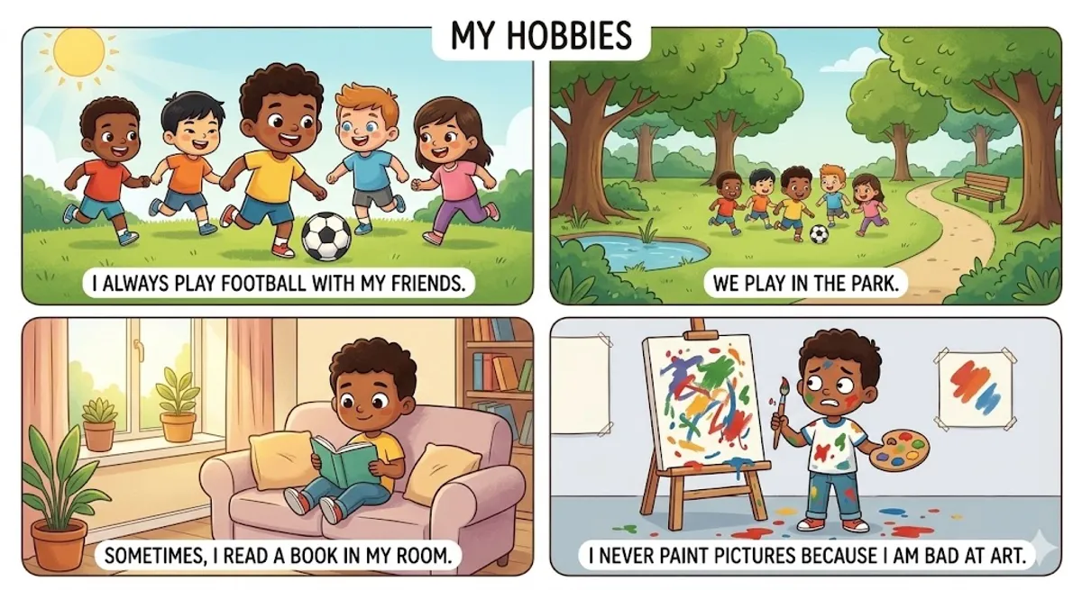 In my free time, I always play football with my friends. We play in the park. Sometimes, I read a book in my room. It is very relaxing. I never paint pictures because I am bad at art. What do you do in your free time?