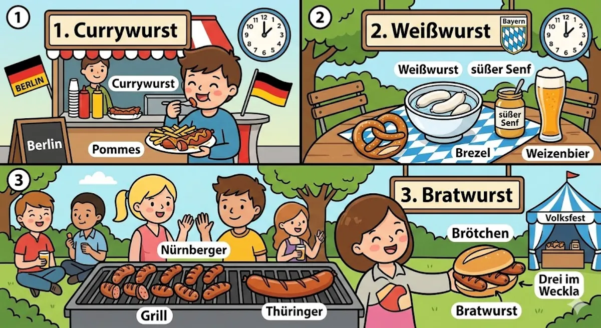 Lerne die deutsche Wurstkultur kennen! Entdecke Currywurst, Weißwurst und Bratwurst in diesem einfachen Text für A1 Deutsch-Lerner.