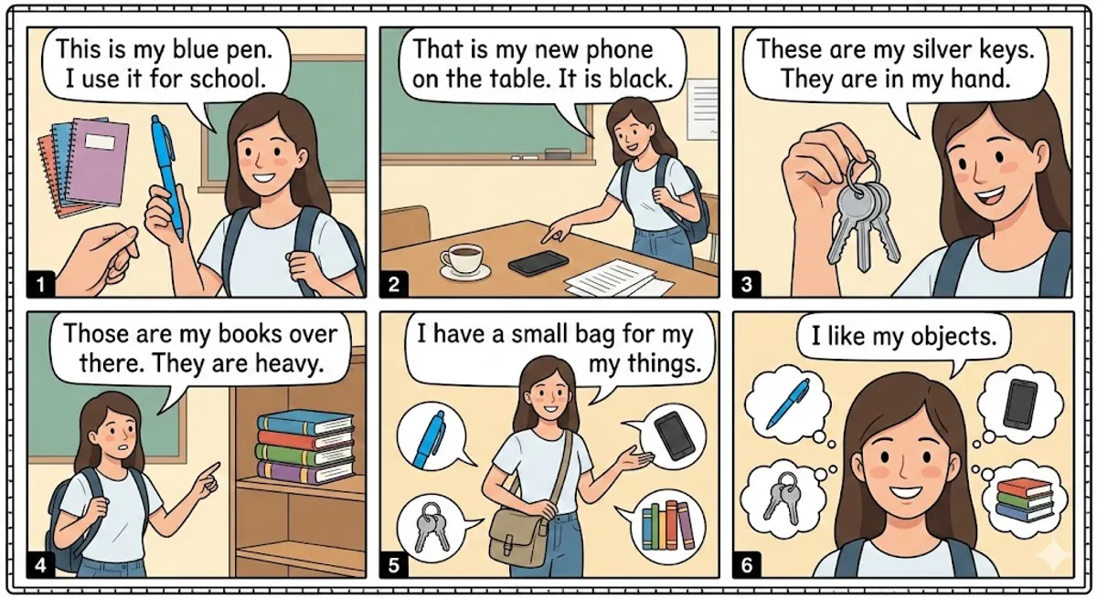 Look at my bag. This is my blue pen. I use it for school. That is my new phone on the table. It is black. These are my silver keys. They are in my hand. Those are my books over there. They are heavy. I have a small bag for my things. I like my objects.