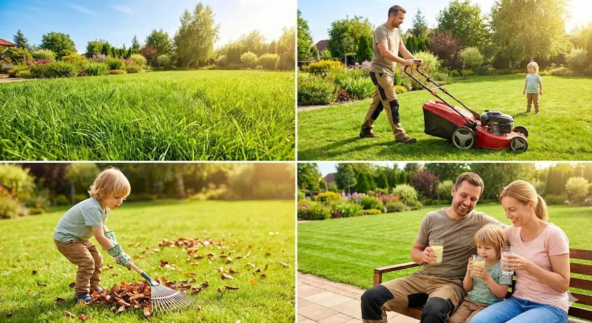 Hoy es sábado. Hace buen tiempo y hay mucho sol. El césped de mi jardín es muy alto y verde. Mi padre corta el césped con una máquina. Yo ayudo a mi padre en el trabajo. Yo uso un rastrillo para limpiar las hojas viejas. Mi madre nos trae agua fría y limonada porque hace calor. Ahora, el jardín se ve muy bonito. Nosotros estamos cansados pero felices.