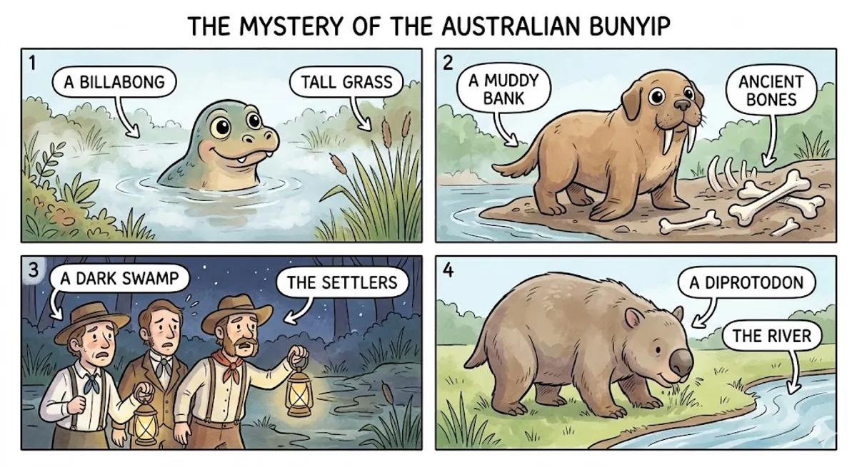 In Australia, the most famous legendary creature is the Bunyip. The name comes from the Aboriginal language and means 'spirit' or 'devil.' According to ancient stories, the Bunyip lives in deep water, such as swamps, billabongs (small lakes), and rivers. People describe the Bunyip in many different ways. Some say it looks like a giant dog with a round face, while others say it looks like a walrus or a large bird. However, everyone agrees on one thing: it makes a terrifying, booming sound at night that can be heard for miles. In the 1800s, European settlers in Australia were very afraid of the Bunyip. They found strange bones in the mud and believed they belonged to the monster. Scientists today think that the legend might have started from real animals. Long ago, Australia had giant animals that are now extinct, like the Diprotodon. It is possible that ancient people saw these animals and created the story of the Bunyip to warn children to stay away from dangerous, deep water. Even now, if you visit a quiet Australian lake at night, the legend of the Bunyip still makes people feel a little nervous.