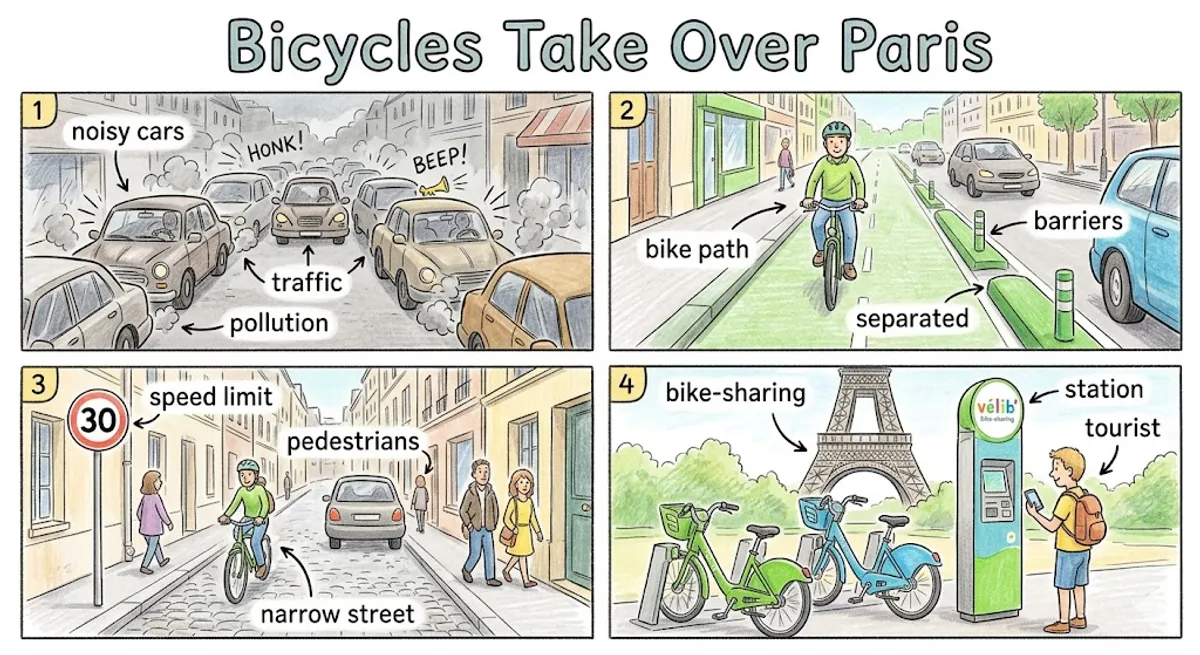 Learn how Paris is changing from a city of cars to a city of bicycles in this easy A2 English reading text.