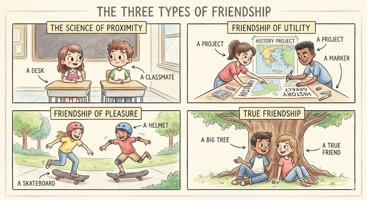 Have you ever wondered why you are friends with the specific people in your group? Often, the answer comes down to a simple scientific concept called proximity. Proximity means being physically close to someone. Research shows that we are highly likely to become friends with people who are near us. For example, you might become friends with the person assigned to sit next to you in science class, or a teammate in your sports club. During our teenage years, school acts like a giant laboratory for relationships. It mixes different people together every day and gives us the time to bond and connect. However, if you think about it, not all friendships are exactly the same. Over two thousand years ago, a famous ancient Greek philosopher named Aristotle thought about this, too. He divided friendships into three distinct categories. Interestingly, his ideas still make perfect sense in our modern world today. The first category is Friendships of Utility. These are convenient friendships based on usefulness. Think of the classmate you talk to only because you are partners on a big history project. You help each other achieve a goal, but you might not hang out outside of school. The second category is Friendships of Pleasure. These relationships are based on shared activities and having fun together. This might be your weekend gaming buddy, or the friend you only see at skateboard practice. You enjoy each other's company while doing a specific hobby, but the connection might fade if the activity stops. The third and most important category is True Friendships. This is the deepest and most meaningful level. You do not just hang out because it is convenient or fun. Instead, you deeply value each other for who you are as individuals. These friends offer a safe and protected space where you can be your weird, unfiltered self without any fear of judgment. You trust them with your secrets and your true feelings. While it is perfectly fine and great to have utility and pleasure friends in your life, true friends are incredibly special. They are the ones who support our physical and mental well-being in the long run. Building true friendships takes time, effort, and honesty, but the reward is a lifelong connection.
