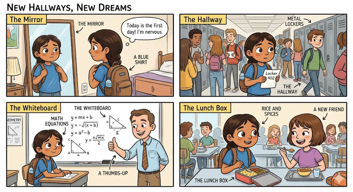 I woke up very early today. My heart was beating fast. Today was my first day at a big American high school. In my home country, schools are small. Here, everything is giant. I put on my favorite blue shirt and packed my backpack. My mother made me a special lunch with rice and spices. I felt nervous because I didn't know if the other students would like me. I looked in the mirror and took a deep breath. 'You can do this,' I whispered to myself. Then, I saw the big yellow bus arriving.