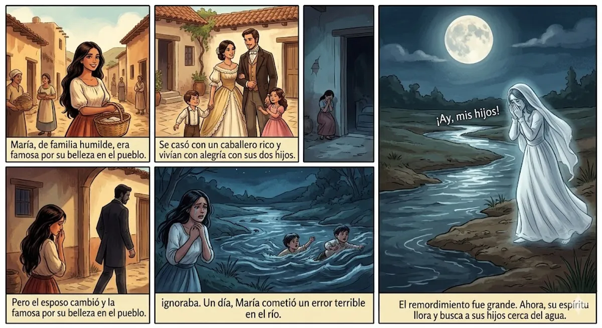 Hace muchos años, en un pueblo pequeño de México, vivía una mujer muy hermosa llamada María. Ella era de una familia humilde, pero su belleza era famosa en toda la región. Un día, un caballero rico y elegante llegó al pueblo. El hombre se enamoró de María inmediatamente y, después de un tiempo, decidieron casarse. Al principio, su vida era perfecta. Tuvieron dos hijos y vivían con mucha alegría. Sin embargo, con el paso de los años, el esposo comenzó a cambiar. Él pasaba mucho tiempo fuera de casa y, cuando regresaba, solo prestaba atención a sus hijos, ignorando a María por completo. Un día, María vio a su esposo con otra mujer de la alta sociedad. En un momento de desesperación, locura y profundo dolor, María llevó a sus hijos a la orilla del río. Allí, cometió un error terrible: dejó que la corriente del agua se llevara a sus pequeños. Cuando se dio cuenta de lo que había hecho, ya era demasiado tarde. El remordimiento fue tan grande que María pasó el resto de sus días caminando por la orilla del río, llorando y gritando. Finalmente, ella también murió de tristeza. Desde entonces, la gente cuenta que el espíritu de María no puede descansar en paz. Dicen que, durante las noches con mucha luna, se puede ver a una mujer vestida de blanco caminando cerca del agua. Se dice que su grito todavía se escucha en el viento: '¡Ay, mis hijos! ¿Dónde están mis hijos?'