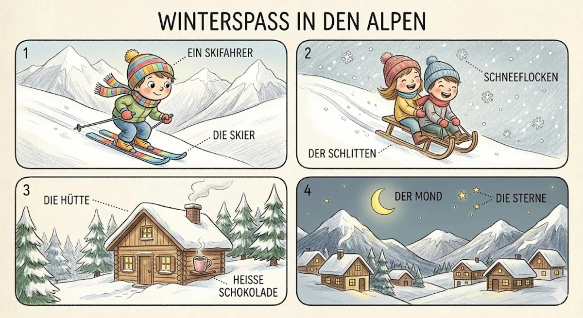 Lerne Deutsch mit diesem A1-Text über Winterurlaub. Entdecke Vokabeln über Skifahren, Rodeln und die schönen deutschen Alpen im Schnee.