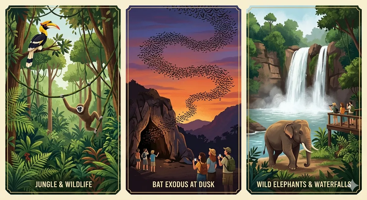 A fascinating sight near the park happens just before sunset. Instead of going deep into the forest, you can visit the local caves to watch millions of wrinkle-lipped bats. These creatures do not migrate to other countries; instead, they fly out every evening to hunt for insects during the night. They emerge together, creating a massive, dark ribbon in the twilight sky. It is a breathtaking event that lasts for an hour. Watching them leave to eat mosquitoes and moths is an unforgettable experience and a great way to start your adventure.