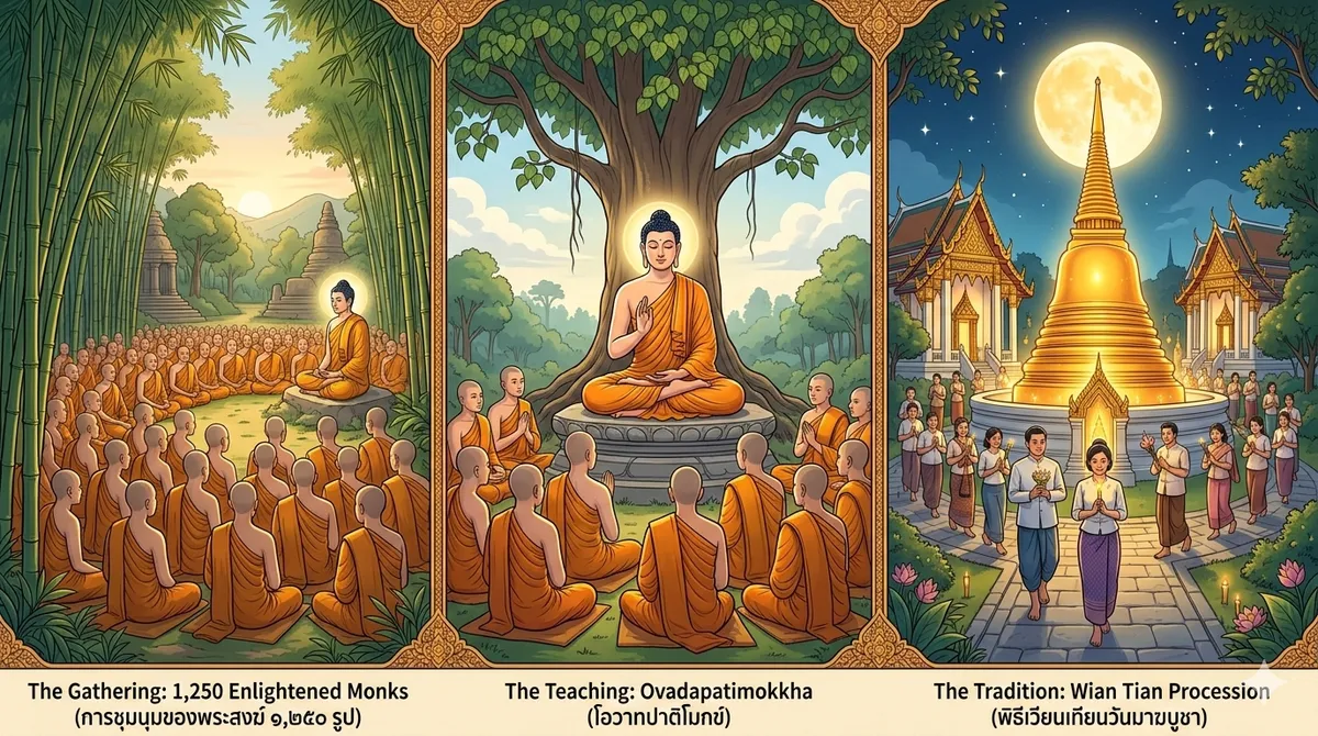 เรียนรู้ประวัติและความสำคัญของวันมาฆบูชา ซึ่งเป็นวันสำคัญทางพระพุทธศาสนาที่เกิดขึ้นในวันเพ็ญเดือน 3 ของทุกปี