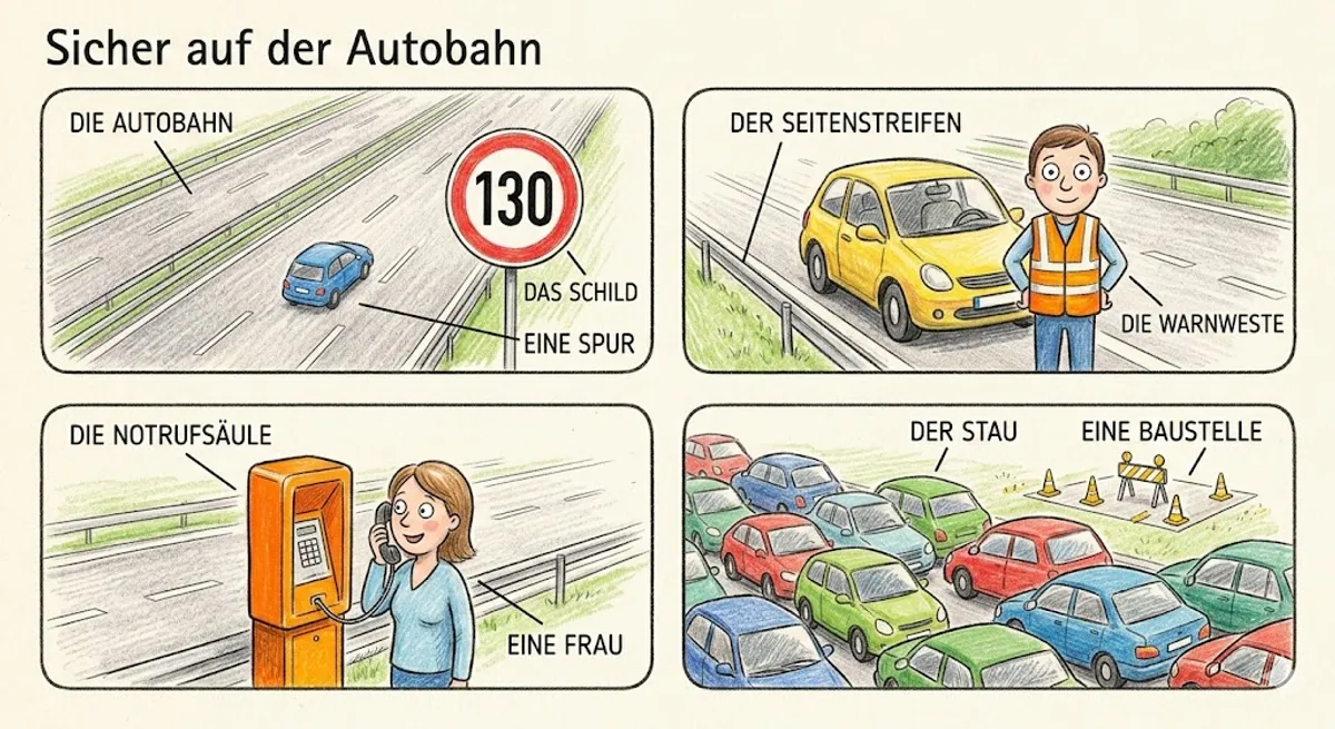 Sicherheit ist auf der Autobahn sehr wichtig. Man darf nicht einfach anhalten. Das ist verboten. Nur wenn das Auto kaputt ist, darf man auf dem Seitenstreifen stehen. Man muss dann eine Warnweste tragen. Das ist eine helle Weste, damit andere Fahrer einen sehen. Es gibt auch Notrufsäulen. Das sind orangefarbene Telefone an der Straße. Wenn man Hilfe braucht, kann man dort anrufen. Man muss auch immer genug Benzin im Tank haben. Wenn das Auto ohne Benzin stehen bleibt, bekommt man eine Strafe. Das ist gefährlich für alle Menschen auf der Straße.