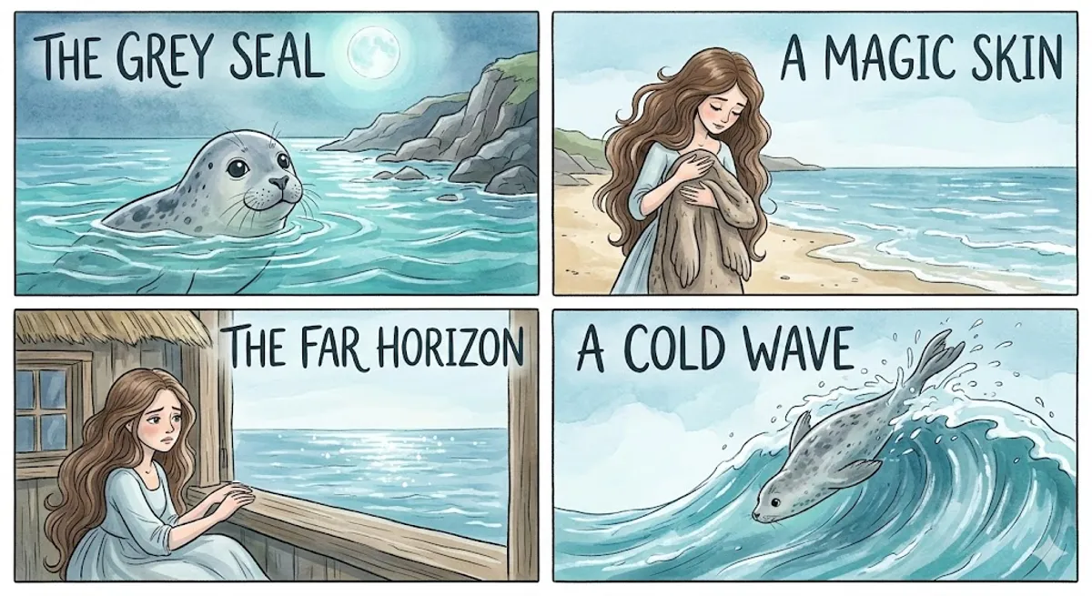 If you visit the cold, rocky coasts of Scotland or Ireland, you might see seals swimming in the ocean. According to local legends, these might not be normal animals. They could be Selkies—magical beings that can change their shape. These mythical creatures are central to Celtic and Norse folklore, representing the deep connection between humans and the mysterious sea. The stories say that Selkies are seals while they are in the water. However, they can come onto the land, shed their seal skins, and become beautiful humans. The transformation is triggered when they step onto the shore, usually during a full moon or a special festival. Once their heavy, grey skin is removed, they appear as men or women of incredible beauty. However, they must guard their skins carefully. If a Selkie loses its skin, it is trapped in human form and cannot return to its underwater home. These stories are often quite melancholy. In many legends, a human man steals a female Selkie’s skin while she is dancing on the beach. Without her skin, she is forced to live as a human wife. She might be a kind and loving mother, but she always stares longingly at the horizon. She feels a profound sense of homesickness for the cold waves. Selkies are known for being gentle and kind, but they are never truly happy on land. Usually, the story reaches a climax when the Selkie, or perhaps one of her children, finds the hidden skin many years later. The Selkie immediately puts it on and returns to the waves, leaving her human family behind without a second thought. While this seems tragic, it represents the Selkie returning to her true nature. These myths help explain the mystery of the ocean and the powerful, inexplicable attraction that many people feel toward the sea. They remind us that some things belong to the wild and can never truly be tamed.