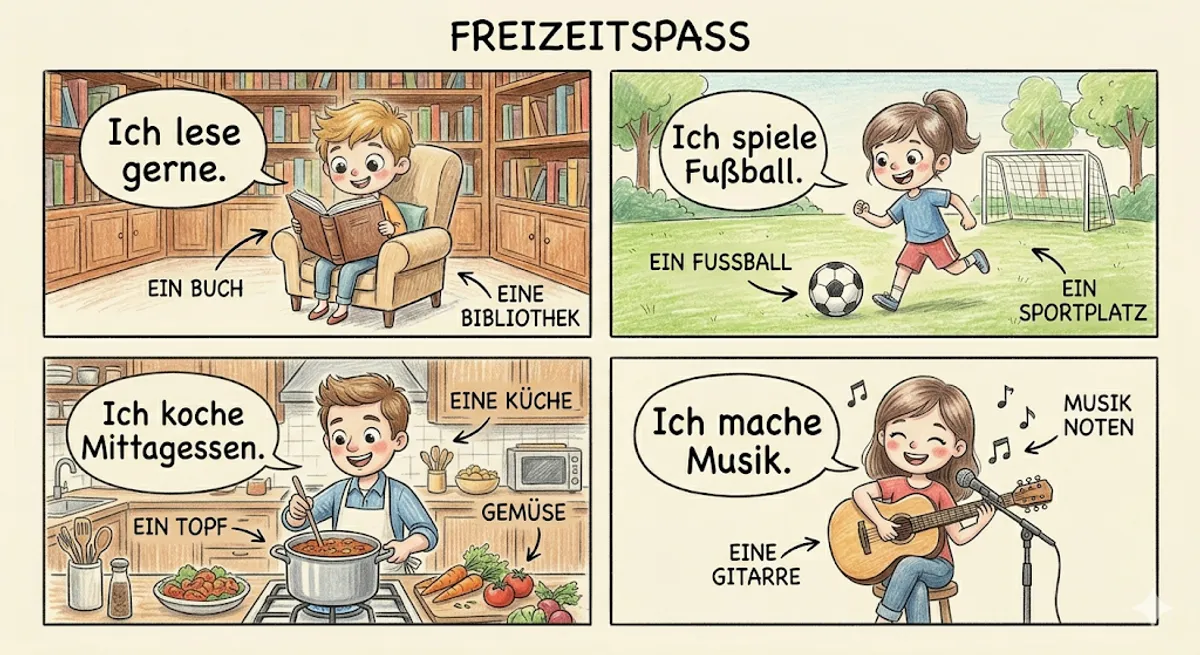 Lies über fünf verschiedene Personen aus Deutschland und ihre Hobbys. Lerne einfache A1 Deutsch-Vokabeln über Aktivitäten, Sport und Freizeit!
