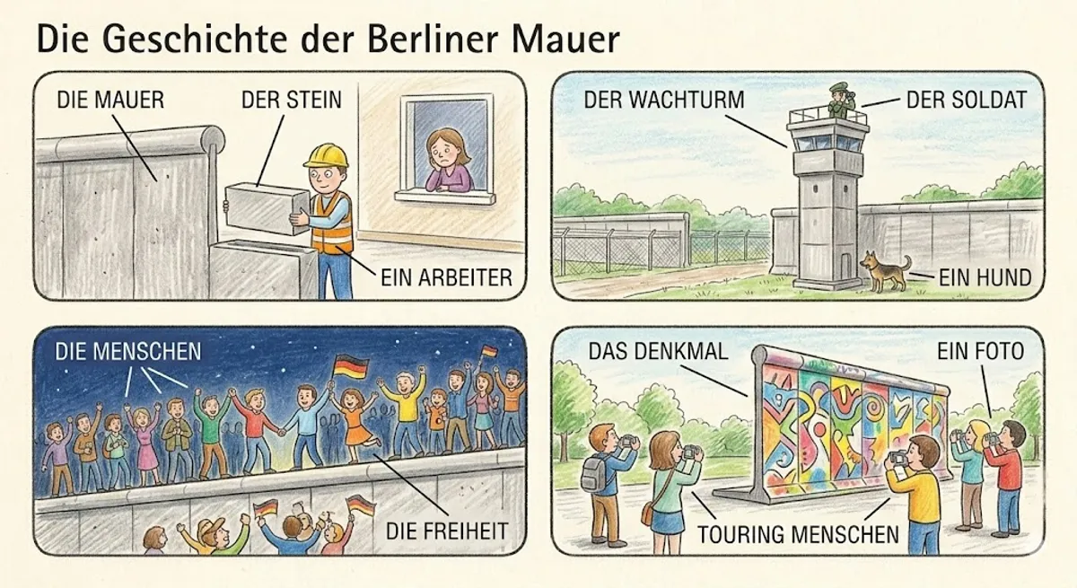 Geteilte: nicht zusammenSeiten: zwei Teile von einer StadtGebaut: ein Haus oder eine Wand machenStein: hartes Material aus der NaturBeton: graues Material für HäuserNiemand: keine PersonGetrennt: nicht mehr zusammenTraurig: das Gegenteil von frohBlieb: an einem Ort seinVerschiedene: nicht gleichQuestions:- Question: Wann wurde die Berliner Mauer gebaut?Options: