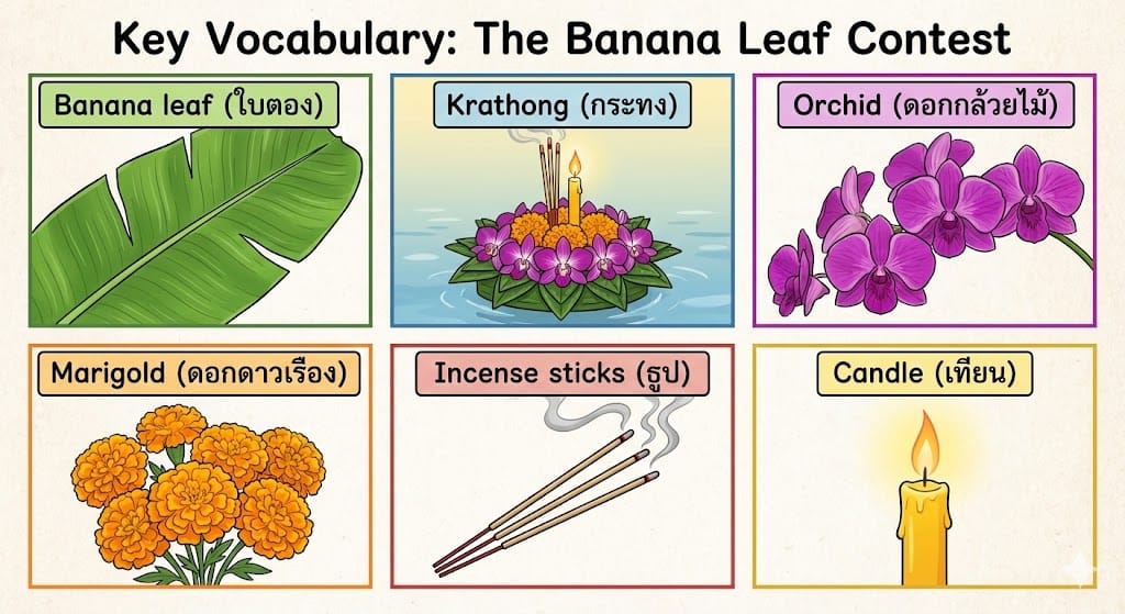 "\"Good morning, class!\" said Teacher Ann with a big smile. The students sat quietly at their desks. \"Next week is the Loy Krathong festival. Our school will have a special contest.\"",